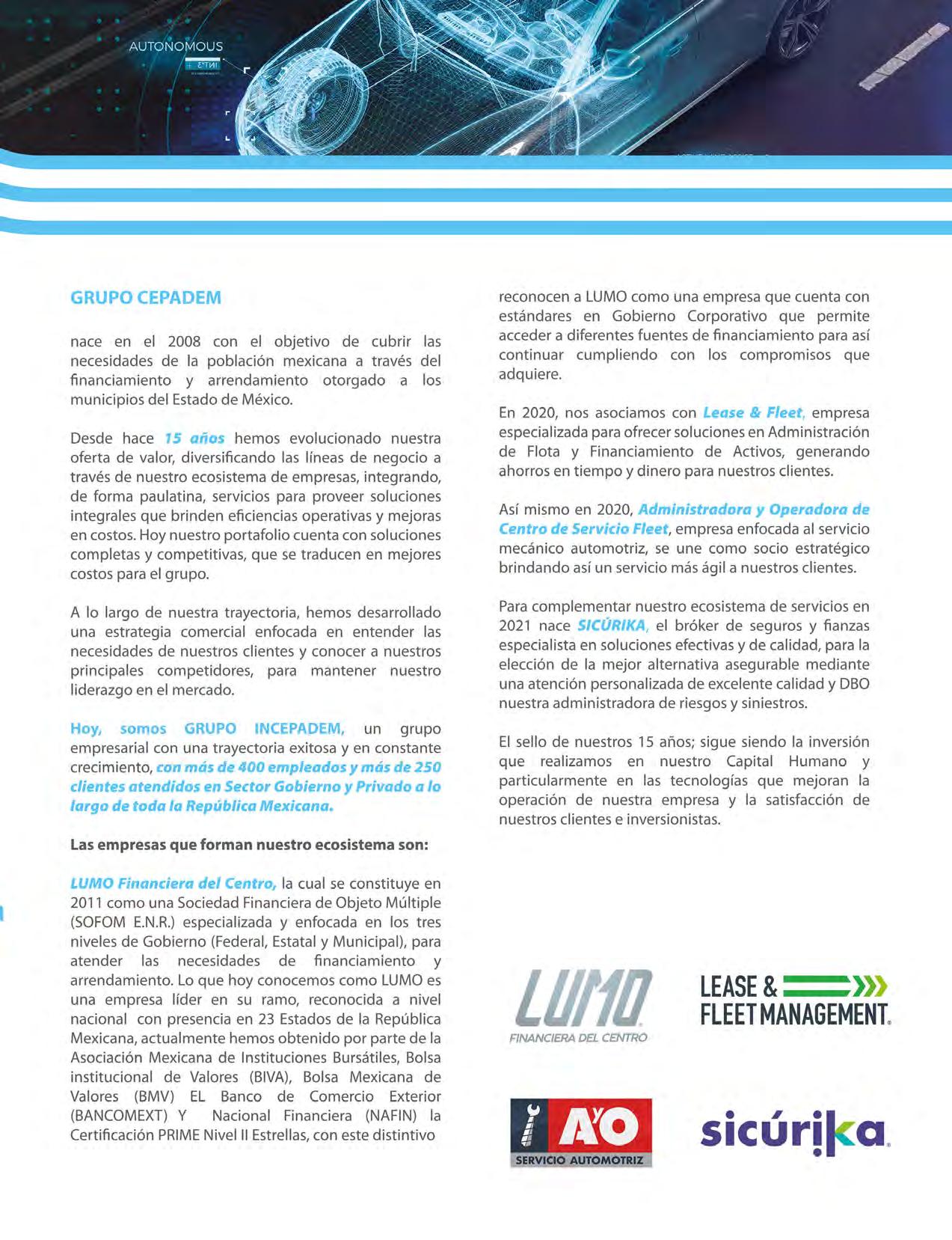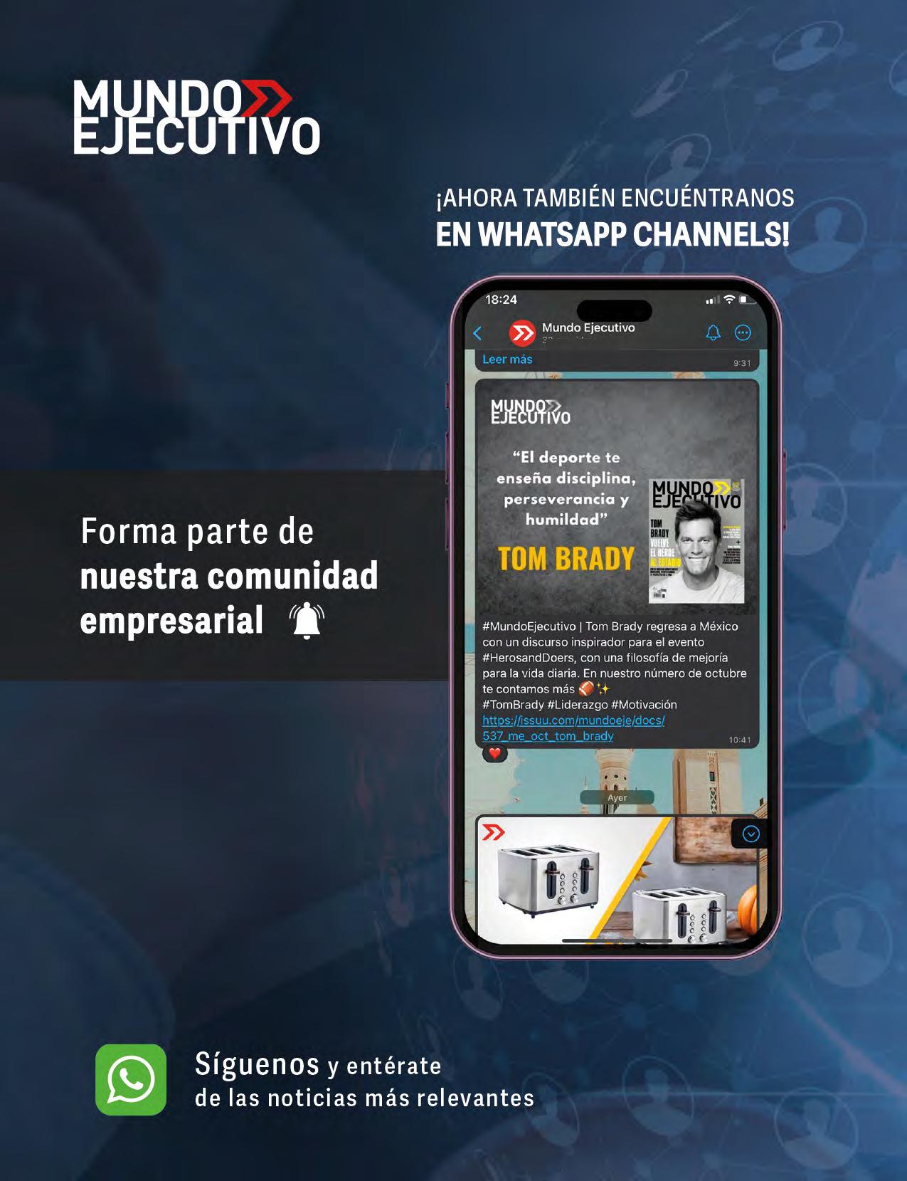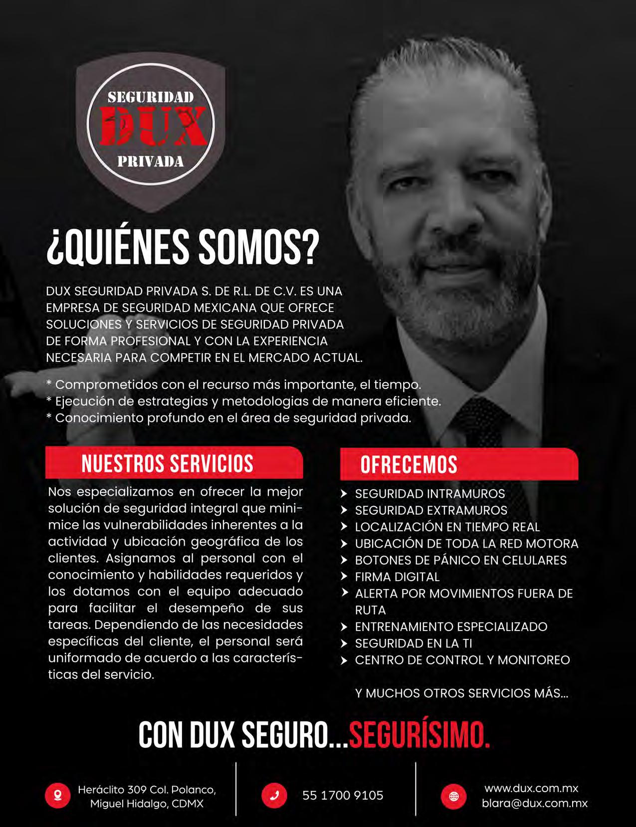 MIL EMPRESAS MÁS IMPORTANTES DE MÉXICO MUNDO EJECUTIVO Año 2023 ® Número 027 Diciembre 2023-2024. Es una publicación mensual de Grupo Mundo Ejecutivo®; Editada y publicada por: Grupo Internacional Editorial, S.A. de C.V., Oficinas Generales: Río Nazas No. 34, Colonia. Cuauhtémoc, Alcaldía Cuauhtémoc, C.P. 06500, Ciudad de México, Teléfono: 55 5002-9400, www.mundoejecutivo.com.mx, Editor Responsable: Rosa Arlenne Muñoz Vilchis. Certificado de Reserva de Derechos al Uso Exclusivo número 04-2002-060617140200-102. Certificado de Licitud de Título número 6547, Certificado de Licitud de Contenido número 6938 ambos otorgados por la Comisión Calificadora de Publicaciones y Revistas Ilustradas de la Secretaría de Gobernación. Permiso SEPOMEX: PP09 – 0225. Se imprime en SMARTPRESS VISION, S.A. DE C.V., Caravaggio 30, Col Mixcoac, CDMX C.P. 03910, TEL 55 5611 8060. Tiraje impreso 51,000 ejemplares. Los artículos firmados son responsabilidad de sus autores y no reflejan necesariamente el punto de vista del editor de la publicación o de Grupo Mundo Ejecutivo®. Queda estrictamente prohibida la reproducción total o parcial de los contenidos e imágenes de la publicación sin previa autorización de Grupo Internacional Editorial, S.A. de C.V. © Grupo Internacional Editorial, S.A. de C.V. © investiga sobre la seriedad de sus anunciantes, pero no se responsabiliza con las ofertas relacionadas por los mismos. Esta es una publicación sólo para adultos. Circulación certificada por el Instituto Verificador de Medio Registro No. 127/21