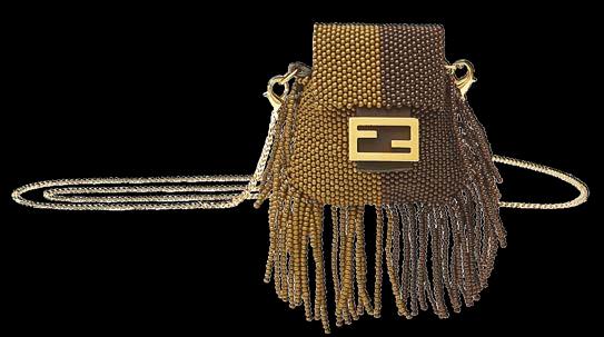 Emblemático bolso Baguette Fendi en su versión Pico, con solapa y cierre FF. Puede llevarse colgado como collar o cruzado gracias a la bandolera fina de cadena. Confeccionado con bordado de microperlas color tabaco y marrón oscuro. Flecos en los extremos y accesorios metálicos con acabado dorado dan un toque chic.