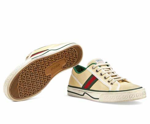 Estos tenis de caña baja se han fabricado en algodón blanco roto. Su diseño combina varios elementos del legado de la firma, como la etiqueta Gucci Tennis 1977, un motivo GG texturizado en la suela y la tribanda. Se trata de detalles que evocan la conexión de la marca con el mundo del deporte y el ocio.