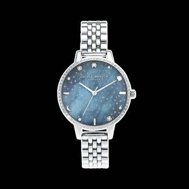 El Celestial de la colección FW20 está inspirado por el brillo del cielo nocturno. Profundos azules y grises que representan la Aurora Boreal y salpicado con brillantes puntos, así como marcadores de lunas y estrellas, con un bisel lleno de cristales. Movimiento japonés Miyota; carátula con brillo en polvo y caja de acero con grabado al reverso. Cristales Swarovsky y perlas cultivadas.
