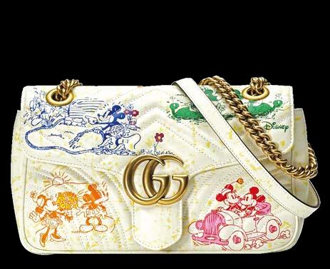 La divertida imagen de Mickey y Minnie Mouse adorna este bolso de hombro GG Marmont pequeño de piel matelassé marfil. Tiene apliques de color oro envejecido y etiquetas en el interior de piel con la marca Disney. Tiene una correa de cadena deslizable a modo de bandolera de 55 cm de altura o asa superior de 30 cm de altura.