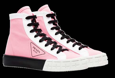 Agregue un toque deportivo y elegante a los looks de la nueva temporada con este par de tenis deportivos de Prada. Este diseño de tonos neutros está cortado con gabardina rosa con detalles en negro y descansa sobre suelas de goma inspiradas en neumáticos de motocross.