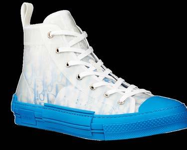 Los sneakers B23 destacan por su superposición de apliques transparentes y de tela con el motivo Dior oblicuo azul degradado. Este modelo reinventado retoma los códigos de la moda deportiva atemporal, gracias a su juego de agujetas con ojales en la parte delantera, su suela gruesa de goma azul en contraste, su punta redondeada y reforzada.