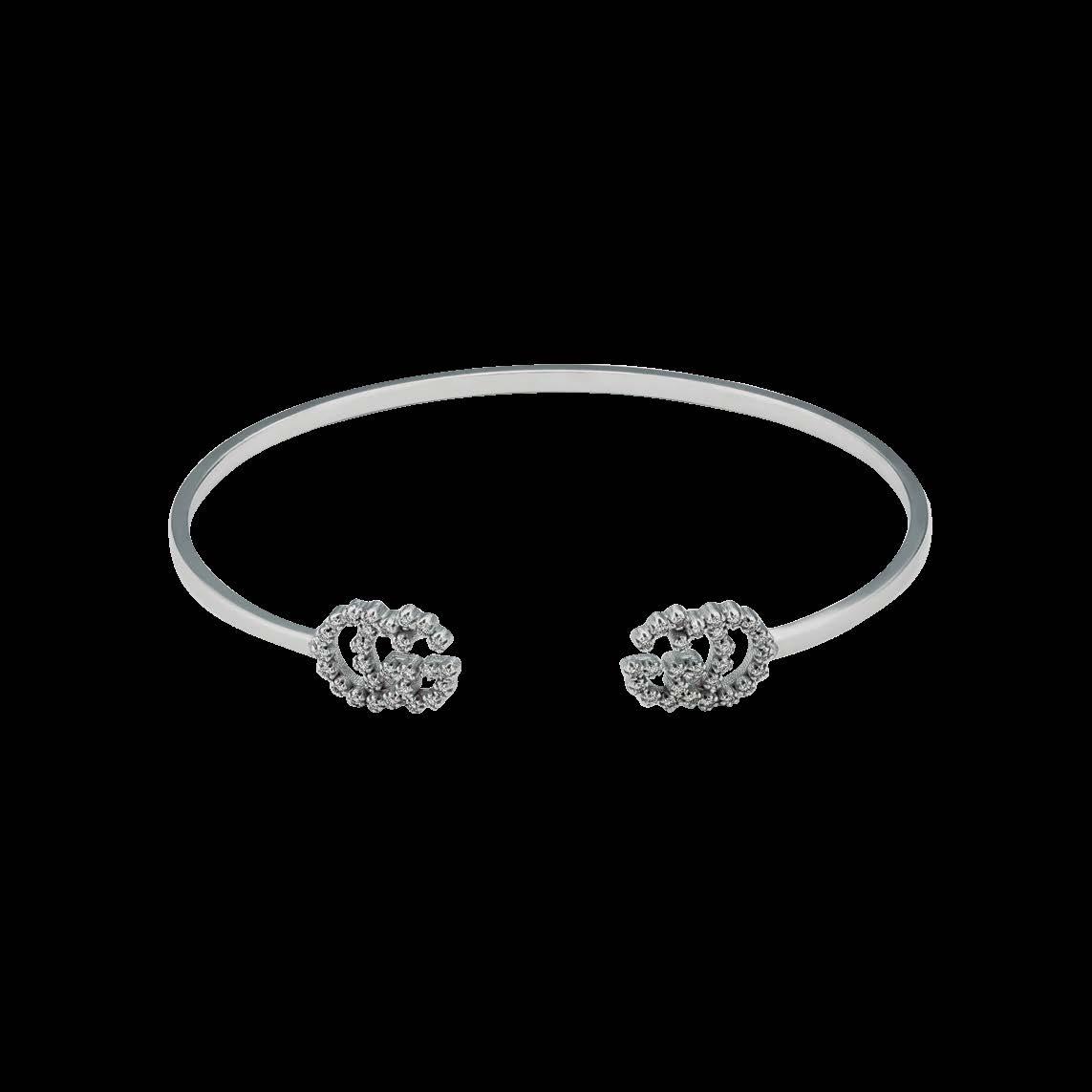 La Double G inspirada en un diseño de archivo de los años 70, una era distintiva de la casa, se encuentra en cada extremo de este brazalete de oro blanco. El motivo emblemático está incrustado con diamantes blancos, mientras que la banda fina y delicada infunde el estilo con un enfoque moderno y minimalista.