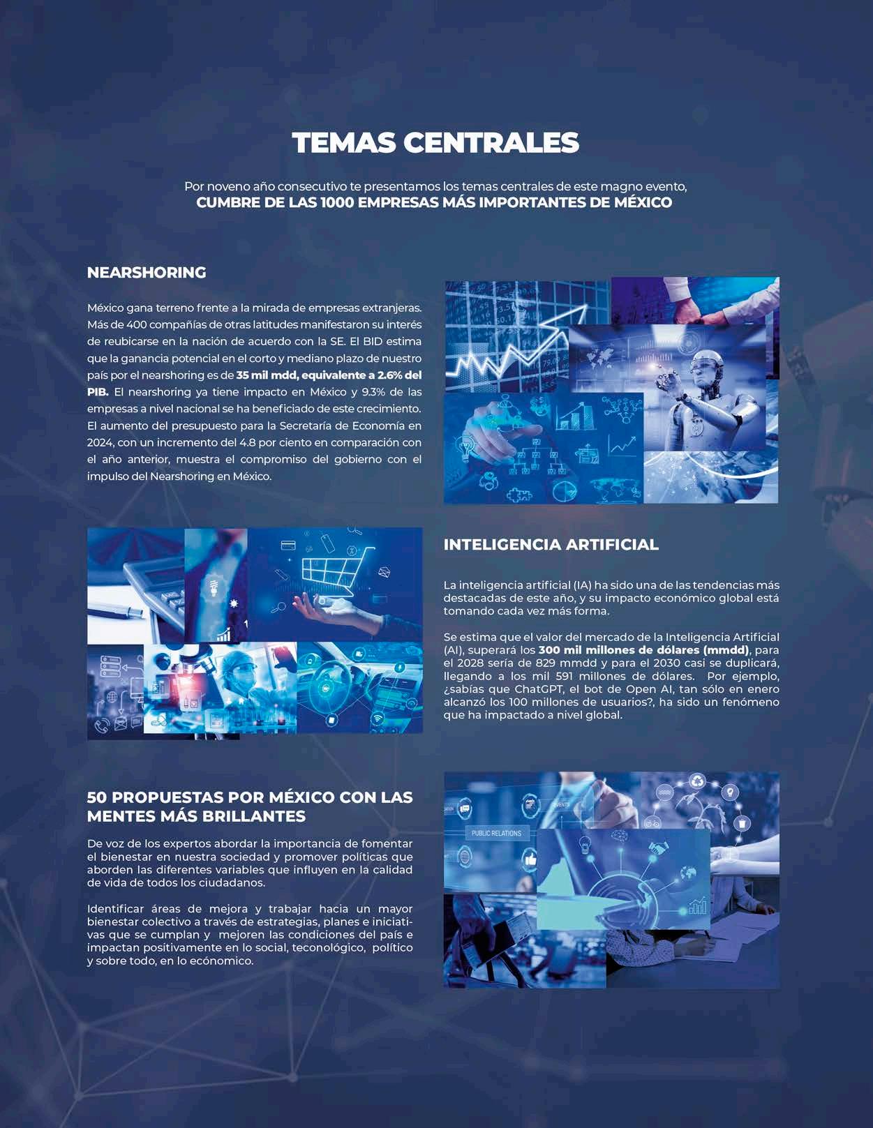 Los sectores de la sociedad se han reconfigurado, se observaron crecimientos que dan cuenta de lo importante que es estar constantemente trabajando por alcanzar una competitividad que como nación sabemos que podemos tener, pero necesitamos fijar un camino claro, y como siempre lo he dicho, trabajar unidos, que es algo que nos caracteriza a los mexicanos. Nadie dijo que en el mundo de los negocios todo sería sencillo, incluso, estoy segura que algunos hemos pensado en algún momento por qué no se ha creado un manual en el que casi como por arte de magia, se solucionen los inconvenientes y los retos que surgen en el día a día, pero no sé qué tan conveniente sería eso, pues pensemos, todo tendría las mismas soluciones, resultados similares, procedimientos repetitivos, y eso, productivo, definitivamente no sería. Aunado a que en nuestras diferencias siempre nos encontraremos, coincidiremos y reconstruiremos. En esta Revista del mes de noviembre, presentamos un panorama económico, en el que tocamos temas sobre relaciones bilaterales, lo que ha pasado con el peso y el dólar, pero también, lo que ocurre en otros continentes y cómo es que esto nos impacta de manera directa o indirecta, por ello les invitamos a generar conversación.