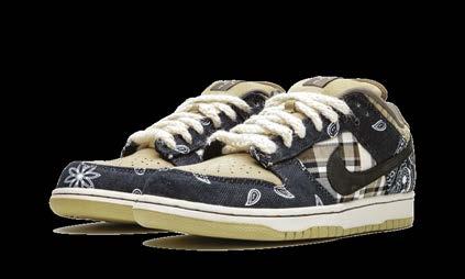 Travis Scott regresa con una nueva interpretación de las Nike SB Dunk Low con una base azul marino con una mezcla de estampados de pañuelo y patrones a cuadros. Las inserciones de color beige en la puntera, la lengüeta y el talón proporcionan contraste, mientras que los cordones de tweed, la suela de dos tonos y el swoosh azul en el exterior y el swoosh rosa en el interior hacen que todo se destaque.