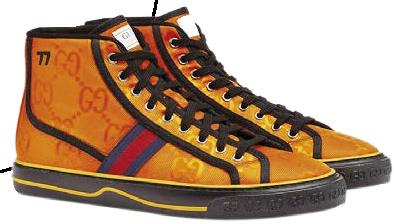 Parte de la colección Tennis 1977, se presentan dentro de una línea de accesorios y prêt-à-porter presentada para Pre-Fall 2020 hecha de materiales y adornos reciclados. El nylon regenerado, confeccionado con hilo de coser y adornos reciclados, muestra el patrón GG contra un fondo opaco en un vivo tono naranja.