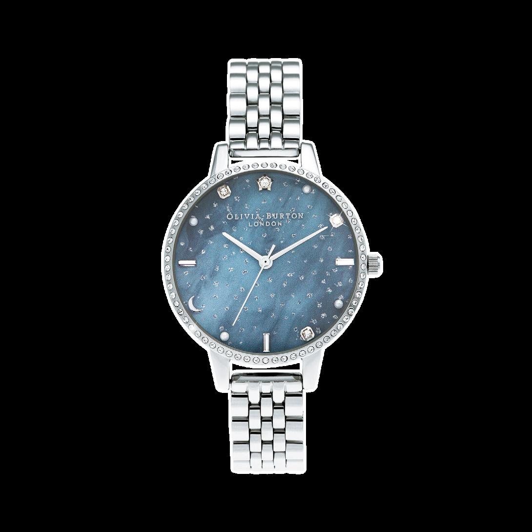 El Celestial de la colección FW20 está inspirado por el brillo del cielo nocturno. Profundos azules y grises que representan la Aurora Boreal y salpicado con brillantes puntos, así como marcadores de lunas y estrellas, con un bisel lleno de cristales. Movimiento japonés Miyota; carátula con brillo en polvo y caja de acero con grabado al reverso. Cristales Swarovsky y perlas cultivadas.