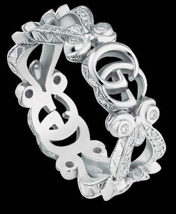 El anillo Gucci de oro blanco de 18k brilla con diamantes blancos incrustados en el diseño floral que se alternan con la reconocible Double G, un distintivo código de la casa. Contiene 74 diamantes, con un total de aproximadamente .35 quilates.