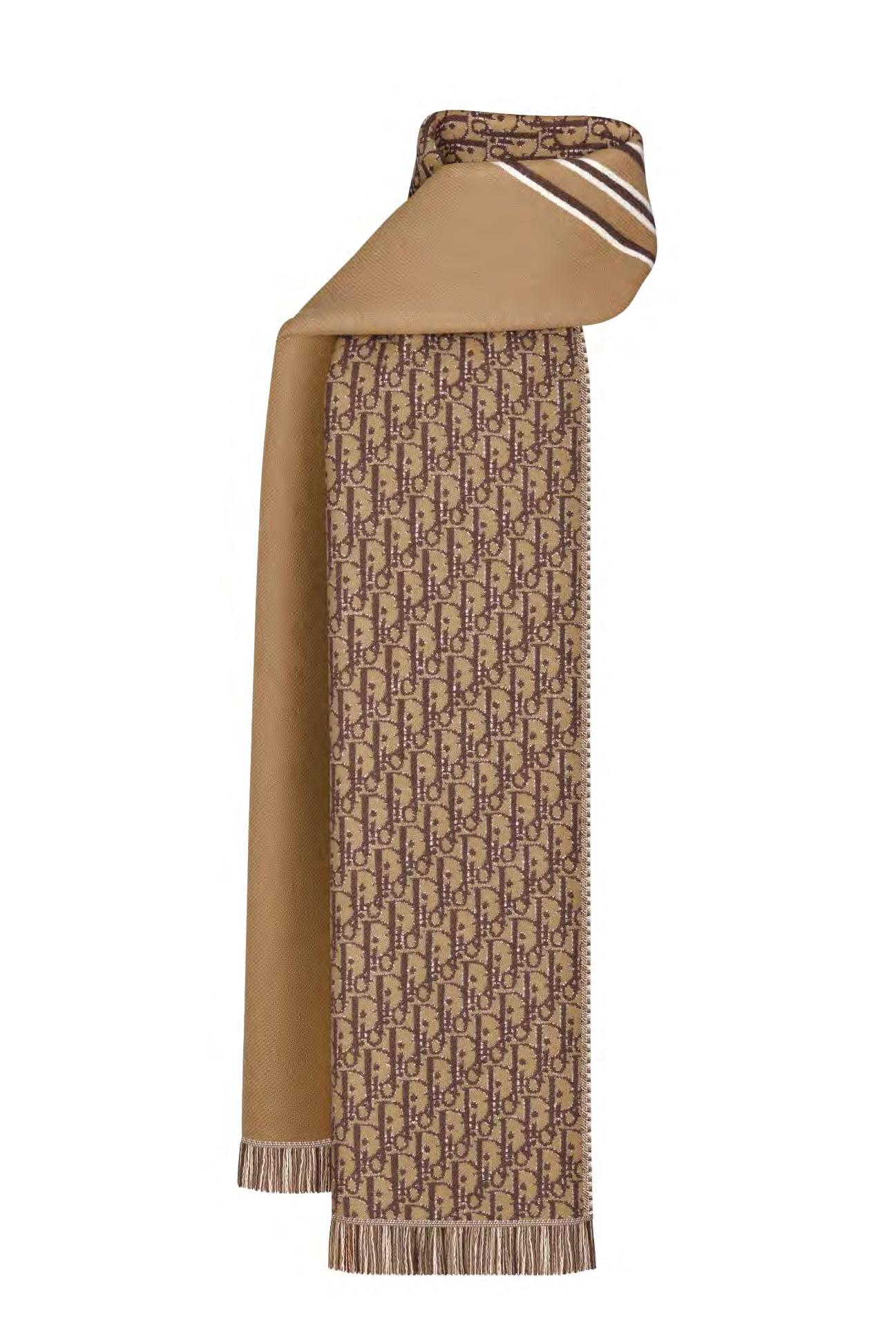 La bufanda beige y ciruela es confeccionada en jacquard de lana. Presenta una banda a rayas que contrasta con el jacquard Dior Oblique de color liso. La bufanda tiene bordes con flecos y se puede llevar de forma clásica alrededor del cuello o simplemente colgada sobre los hombros. //@revistacosasmx