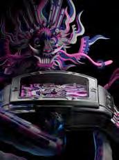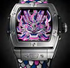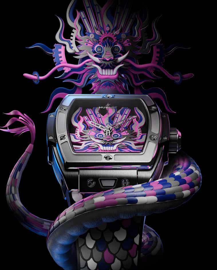 Sus componentes (agujas, engranajes y tornillos) están colocados creando capas multidimensionales que dan forma a la silueta de un dragón creado con recortes de papel por la artista china Chen Fenwan. La cabeza del dragón se compone de cinco capas que se alternan entre las agujas, las ruedas y los tornillos con forma de H, con un cuerpo y escamas que se extienden hasta la correa. Los colores reflejan los de la escultura de papel cortado creada por Chen Fenwan. Por primera vez, Hublot presenta una correa de caucho con un diseño de marquetería. Esta edición limitada de 88 piezas, creada en colaboración con la artista china Chen Fenwan, es la fusión perfecta de tradición y modernidad.