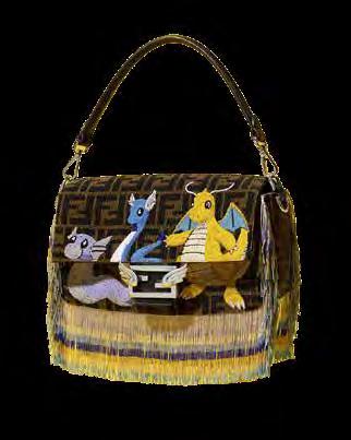 El Icónico bolso Baguette mediano que forma parte de la colaboración FENDI x FRGMT x POKÉMON, para celebrar el Año del Dragón. Totalmente bordado con cuentas que crean el icónico motivo FF y las figuras de Dratini, Dragonair y Dragonite. Adornado con cuero negro y adornado con un cierre FF con alas de metal. Los bordes están decorados con flecos de pedrería multicolor.