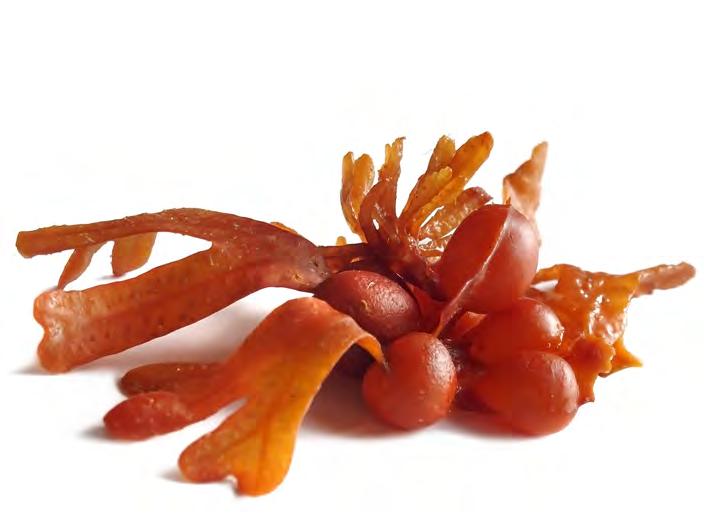 Fucus vesiculosus: Es un alga comesti ble rica en vitaminas, minerales y vitaminas que se ha utilizado tradicionalmente para el tratamiento del reumatismo y la artritis. Entre sus componen tes destacan la fibra, la vitamina C, los polifenoles y otros fitoquímicos como la clorofila, los carotenoi des, la luteína, los mucílagos, el yodo, el calcio, fós foro, el hierro y el magnesio.