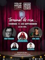 En la página openair.mx y SuperBoletos.com puede revisar toda la cartelera del mes. Habrá un Show Terminal de Risa el 11 de septiembre a las 22 hrs con Kike Vazquez, Ana Julia, Aleza Zuart y Mini García.