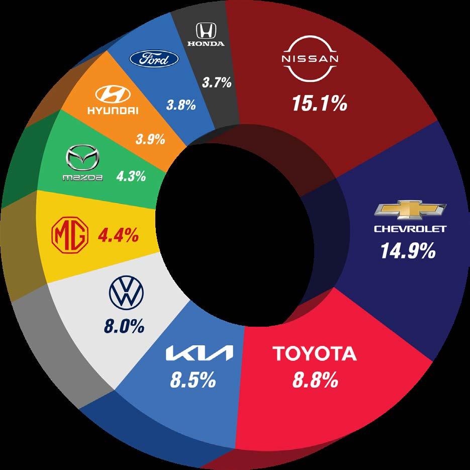 2 TOP 10 2022 QUIÉN ES QUIÉN EN LA INDUSTRIA AUTOMOTRIZ MEXICANA TOP 10 DE MARCAS EN EL ACUMULADO ENERO-NOVIEMBRE Crisis en la cadena de suministros, desde micro procesadores hasta, neumáticos, aceite y saturación en las navieras provocaron no sólo escases de autos para todas marcas, esto provocó también un alza en los precios desde un 15 hasta un 35 % en la mayoría de las marcas. Sin embargo, hubo algunas marcas que pudieron sortear mejor esta crisis y se vio reflejado en sus ventas. Aquí te presentamos el “Top 10” de ventas por marca y modelos en nuestro país. NOTA: Esta tabla refleja los resultados por marca y no por grupos automotrices, como lo reporta la AMIA. MARCA Pos. 1.3.5.7.9.10.8.6.4.2.UNIDADES PARTICIPACIÓN DE MERCADO NISSAN TOYOTA VW MAZDA FORD HONDA HYUNDAI MG KIA CHEVROLET 145,965 85,394 76,936 41,090 36,957 36,195 38,043 42,841 81,789 137,899 15.1% 8.8% 8.0% 4.3% 3.8% 3.7% 3.9% 4.4% 8.5% 14.9%
