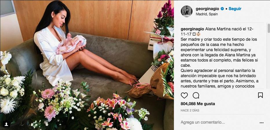 Para Georgia Rodríguez, pareja del futbolista portugués del Real Madrid Cristiano Ronaldo, es de lo más relevante compartir la alegría que le resulta convertirse en madre, por lo que la modelo presumió a Alana Martina dos días después de su nacimiento. En la imagen puede apreciarse a la nueva mamá cargando a su pequeña hija en un sillón rodeada de arreglos florales.