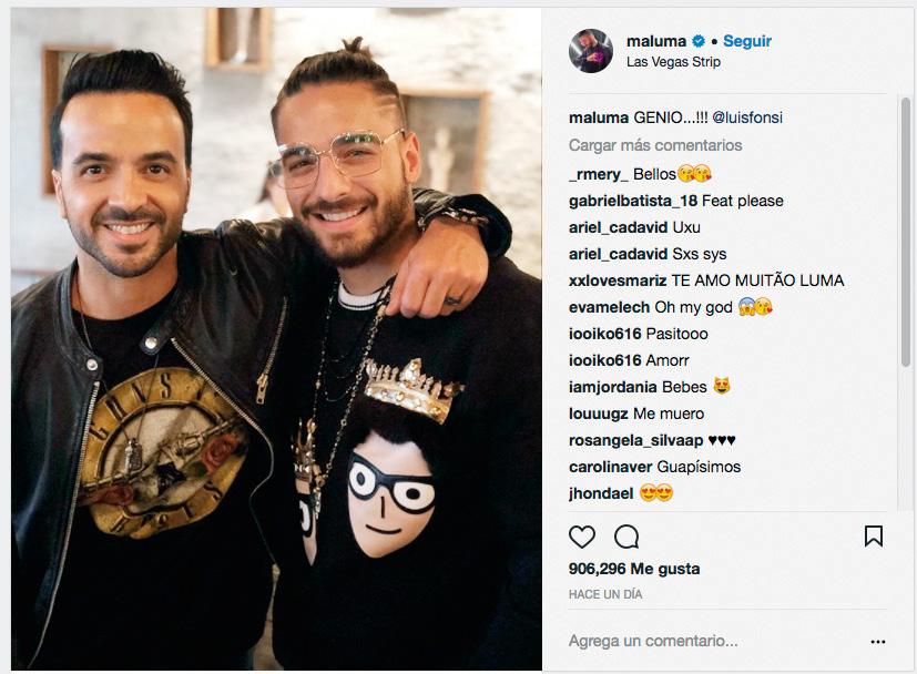 Las Vegas fue el lugar de encuentro de Luis Fonsi y del colombiano Maluma, los intérpretes no perdieron la oportunidad de subir una foto a su Instagram y así recordar el encuentro. Ambos artistas coincidieron en la ciudad donde se realizó la entrega de los Grammy Latino y no desaprovecharon la oportunidad de fotografiarse juntos, causando revuelo en sus miles de fans a nivel mundial.