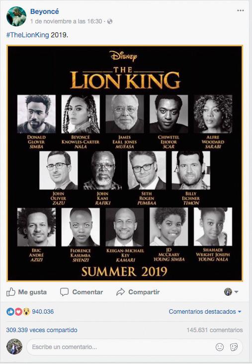 Con una publicación en Facebook, la cantante Beyoncé, dio a conocer que formará parte del elenco al dar vida a Nala, en el próximo filme El Rey León, remake de la cinta de 1992. Otros involucrados en la cinta son Donald Glover, quien doblará a Simba, James Earl Jones, se ocupará el papel de Mufasa, y Chiwetel Ejiofor será el encargado de ponerle voz al malvado Scar.
