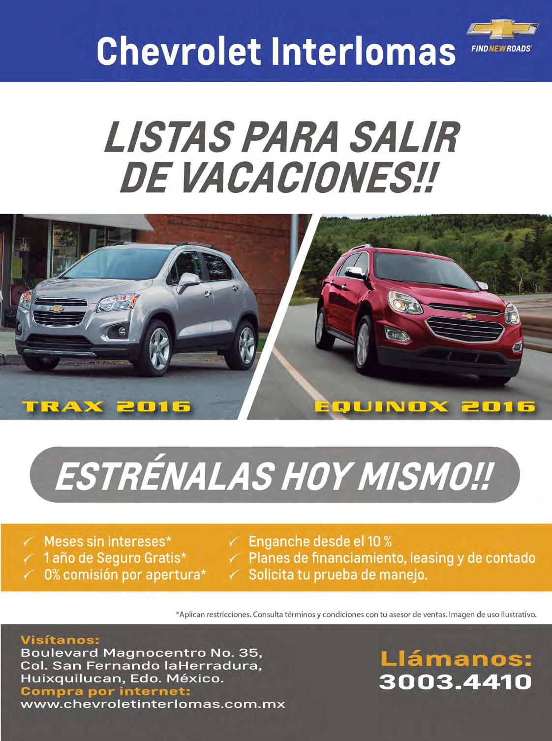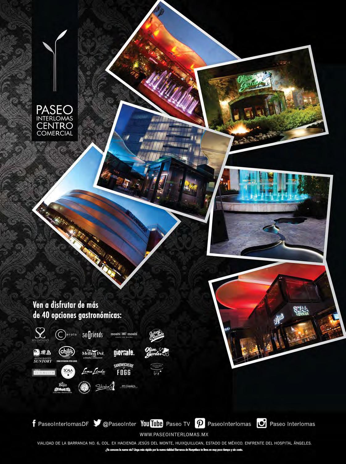 COLONOS INTERLOMAS Año 1 • Número 16 • Julio de 2016. Es una publicación mensual de Grupo Mundo Ejecutivo®; Editada y publicada por: Comercializadora Mundo Rewards S.A. de C.V., Oficinas Generales: Río Nazas No. 34 Planta Baja, Col. Cuauhtémoc, C.P. 06500, Delegación Cuauhtémoc México, D.F. Teléfono: 5002-9500. www.mundoejecutivo.com.mx Editor Responsable: Rosa Arlenne Muñoz Vilchis. Certificado de Reserva de Derechos al Uso Exclusivo número 04-2010-041612575700-101. Certificado de Licitud de Título y Contenido 14925. Se imprime en los talleres de CICSA, con dirección en Avenida México Coyoacán núm 40, Col. Santa Cruz Atoyac, Delegación Benito Juárez, C.P. 03310 cdmx, 56287878 ext. 1741. Los artículos firmados son responsabilidad de sus autores y no reflejan necesariamente el punto de vista del Editor de la publicación o de Grupo Mundo Ejecutivo®.Queda estrictamente prohibida la reproducción total o parcial de los contenidos e imágenes de la publicación sin previa autorización de Comercializadora Mundo Rewards S.A. de C.V. ©.Comercializadora Mundo Rewards S.A. de C.V. investiga sobre la seriedad de sus anunciantes, pero no se responsabiliza con las ofertas relacionadas por los mismos.