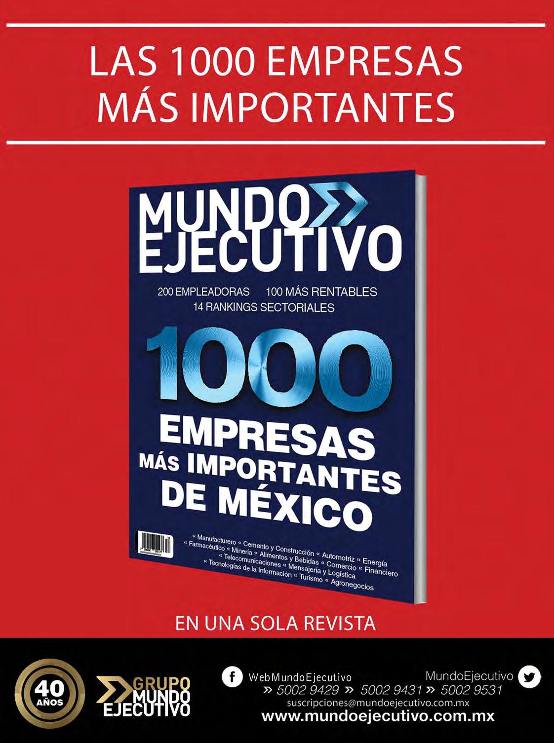 Arte Digital: Ericka Castillo y Miguel Fajardo / Directora Editorial Corporativa: Arlenne Muñoz / Asistente Editorial: Ma. Eugenia Mata / Gerente de Producción y Compras: Zitlaltzin Villagrán / Asistente de Producción y Tráfico: Atahín Bautista / Producción y Control de Calidad: Aarón Rangel / Directora Comercial: Erika Magaña erika.magana@ mundoejecutivo.com.mx / Mercadotecnia: Daniel Pérez Alamillo / Gerente Comercial: Alejandra Ramos alejandra.ramos@mundoejecutivo.com.mx, Patricia Roque patricia.roque@mundoejecutivo.com.mx / Responsable de suscripciones: Irma Ruiz Irma.ruiz@mundoejecutivo.com.mx Tel: 5002 9429