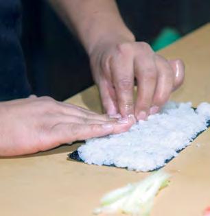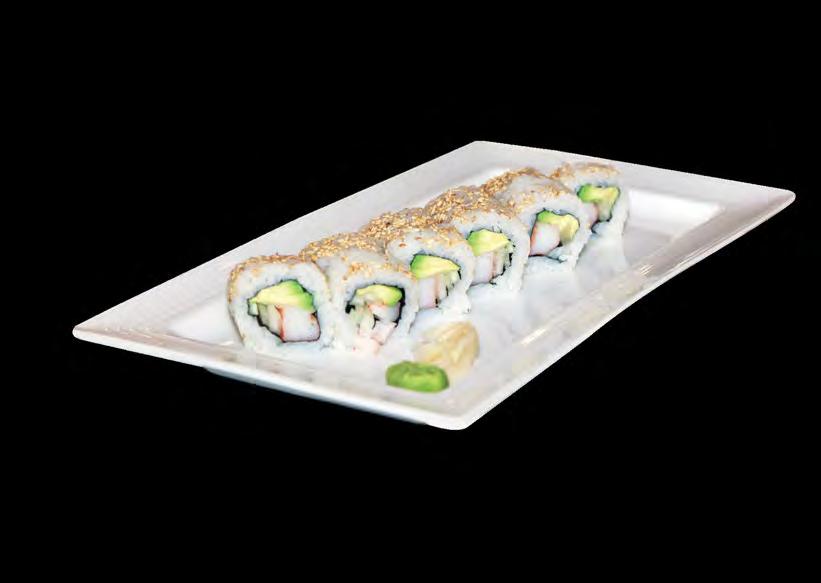 1. Humedecer las manos para extender el arroz sobre la lámina de nori hasta que quede uniforme sobre la esterilla. 2. Agregar el ajonjolí por todo el arroz, y aplicar el relleno de kanikama, pepino y aguacate. 3. Enrolla con fuerza para que se selle y empuja las orillas para que quede completamente la forma. 4. Corta a la mitad y junta. Después corta en cinco piezas iguales. Acomoda en un plato y decora con un poco de jengibre.