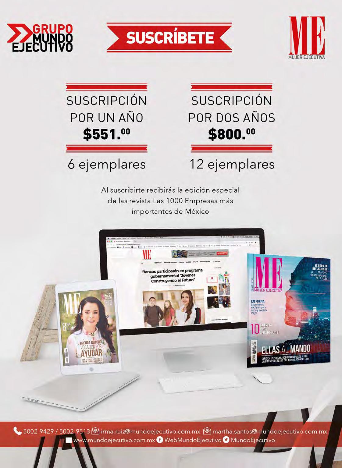 Responsable de suscripciones: Irma Ruiz irma.ruiz@mundoejecutivo.com.mx Tels. 5002 9429, 5002 9513, 5002 9431 y 5002 9428