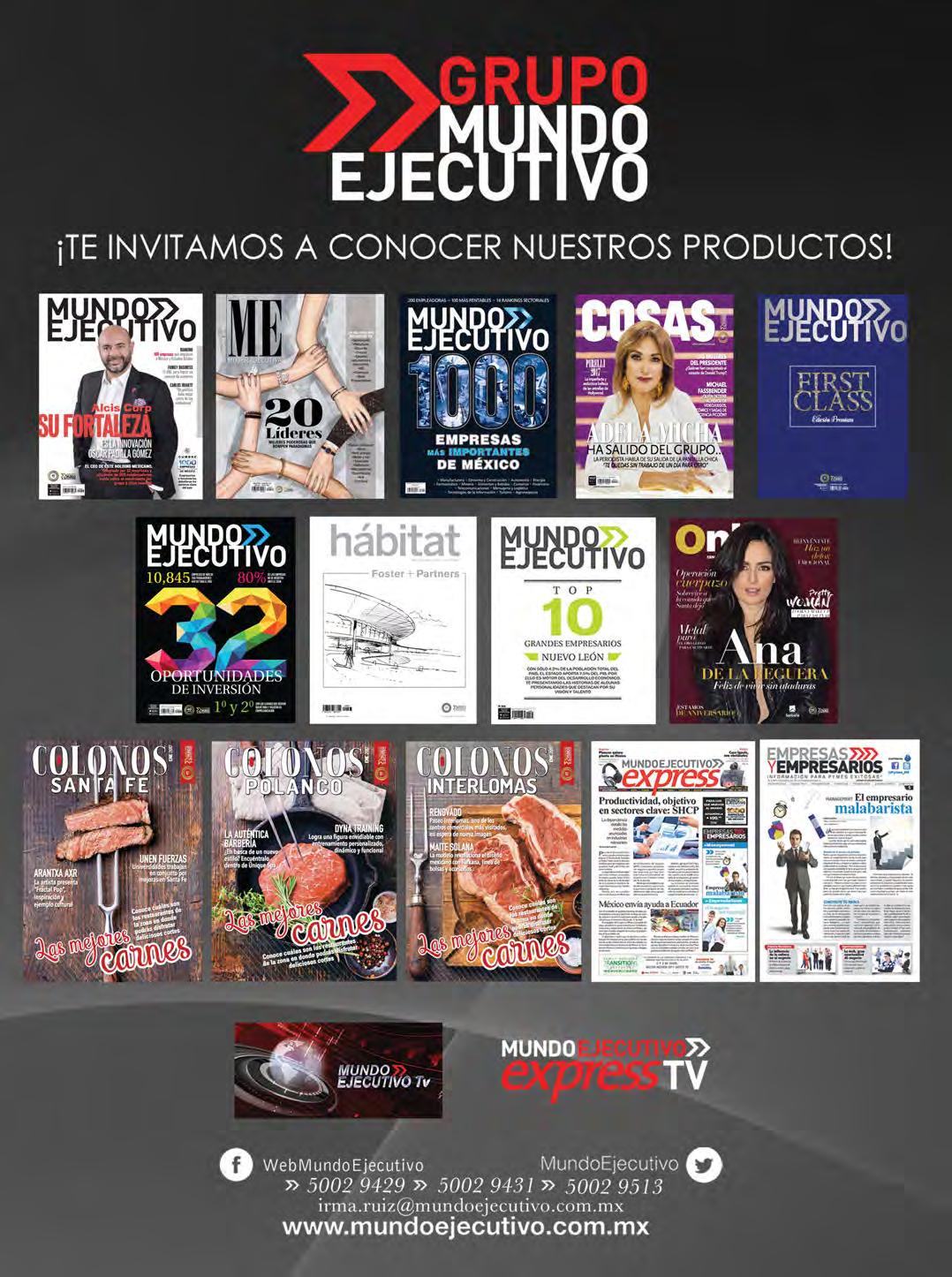 Directora Editorial Corporativa: Arlenne Muñoz Asistente Editorial: Ma. Eugenia Mata Gerente de Producción y Compras: Zitlaltzin Villagrán Asistente de Producción y Tráfico: Atahín Bautista Producción y Control de Calidad: Aarón Rangel Dirección Comercial: Benjamín Fontaine Mercadotecnia: Daniel Pérez Gerente Comercial: Alejandra Ramos alejandra.ramos@mundoejecutivo.com.mx Responsable de suscripciones: Irma Ruiz irma.ruiz@mundoejecutivo.com.mx Tel: 5002 9429