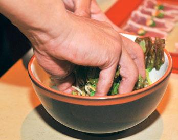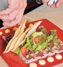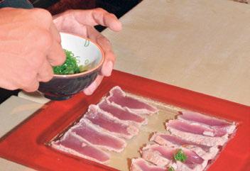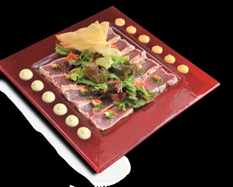 1. Se sella el atún con aceite vegetal y sal pimienta a 180º. 2. Cortar el sashimi (rebanadas delgadas), colocándolo en un plato, a cada corte se le agrega un poco de cebollín, rábano y jengibre. 3. En un recipiente por separado, se mezcla un poco de aceite de ajonjolí y salsa ponzu en el mix de lechugas y colocarlo a un lado del sashimi.Se rebanan los jitomates cherrie y se distribuyen en el plato. 4. Agregar chile en polvo shichimi sobre todo el plato, esparciendo sobre lechugas y sashimi; antes de servir se agrega salsa ponzu sobre sashimi. Decorar con mayonesa de aguacate y de chipotle para acompañar.