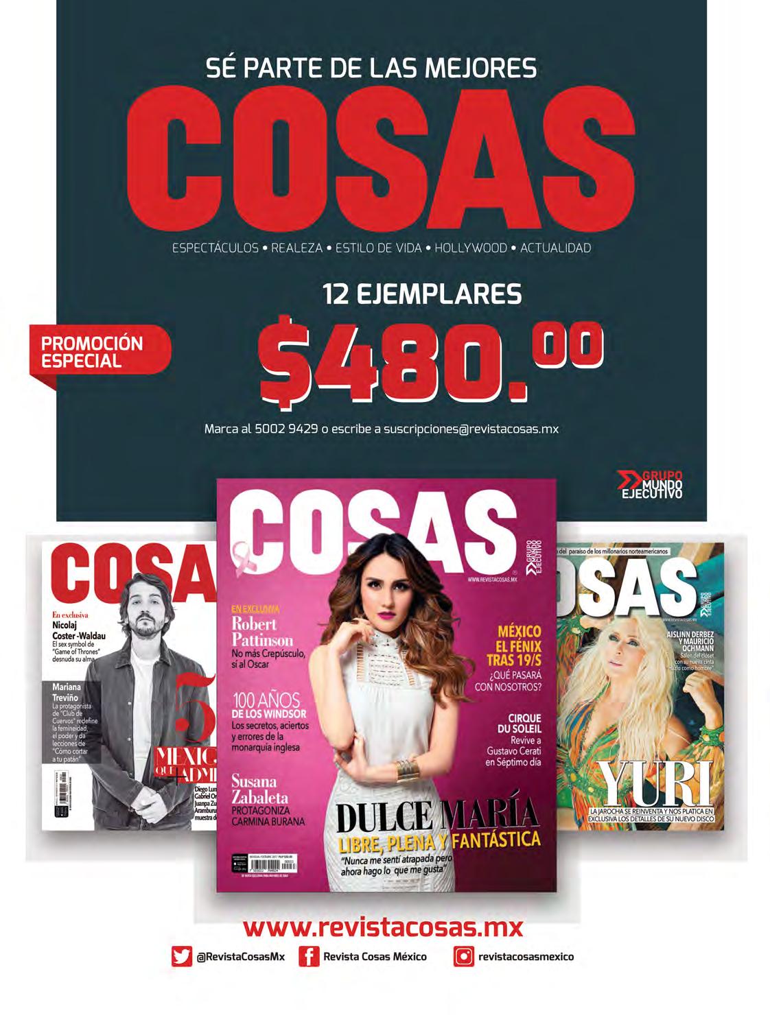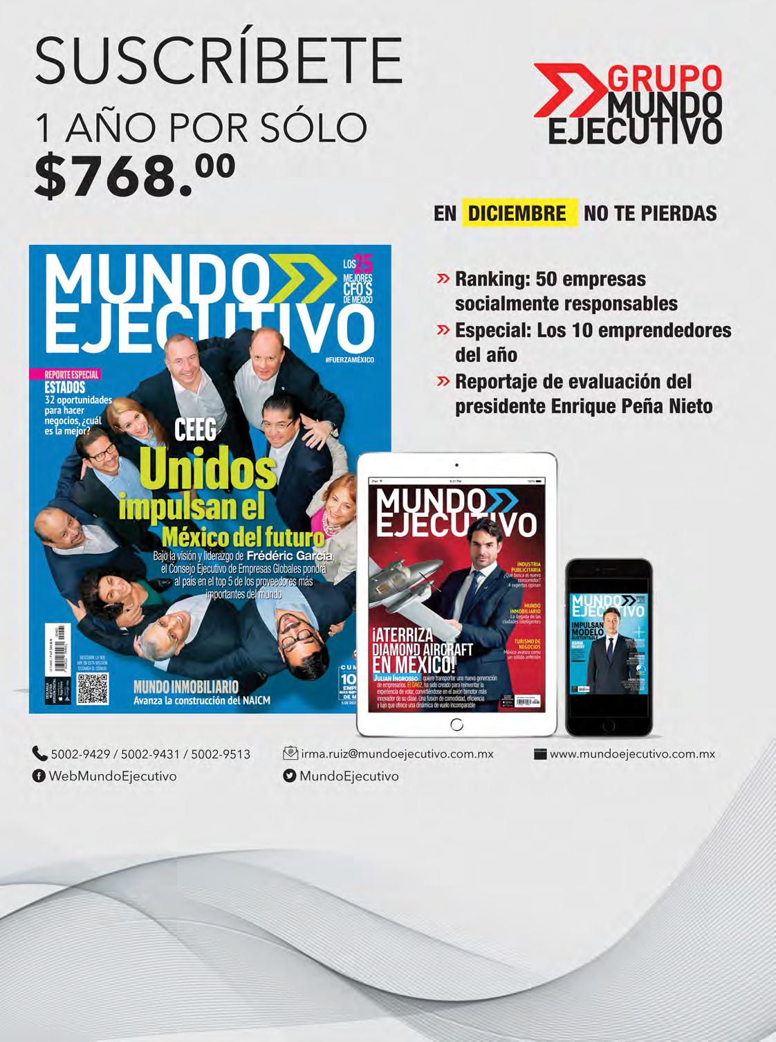 Directora de producto: Claudia Coratella Editora: Bianca Pescador Reporteros: Alberto Vega y Regina Lázaro Corrección de estilo: Andrea Norzagaray Editor de Fotografía: Antonio Soto Fotografía: Ricardo Trejo y Jesús Gutiérrez Directora de Arte: Nax Aguilar Diseño: Gustavo Gómez, Ma. Fernanda Osorio, Nayhely Hernández y Karina Parra Arte Digital: Ericka Castillo y Miguel Fajardo Asistente Editorial: Ma. Eugenia Mata Gerente de Producción y Compras: Zitlaltzin Villagrán Asistente de Producción y Tráfico: Atahín Bautista Producción y Control de Calidad: Aarón Rangel Dirección Comercial: Benjamín Fontaine Director de Cuentas Estratégicas: José Antonio Kuri Mercadotecnia: Daniel Pérez Relaciones Públicas y Nuevos Negocios: Arlenne Muñoz Gerente Comercial: Alejandra Ramos alejandra.ramos@mundoejecutivo.com.mx Responsable de suscripciones: Irma Ruiz irma.ruiz@mundoejecutivo.com.mx Tels. 5002 9429, 5002 9513, 5002 9431 y 5002 9428