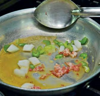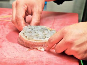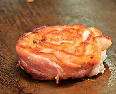 1. Abrir el camarón, limpiarlo por dentro y envolverlo en forma de un medallón con tocino alrededor. 2. Cocinar el medallón a la plancha y gratinarlo 3. Hacer la salsa con apio, cebolla, tocino, champiñón, morrón, y vino blanco. 4. Servir el medallón bañado con la salsa y acompañarlo con una guarnición de arroz y vegetales cocidos.