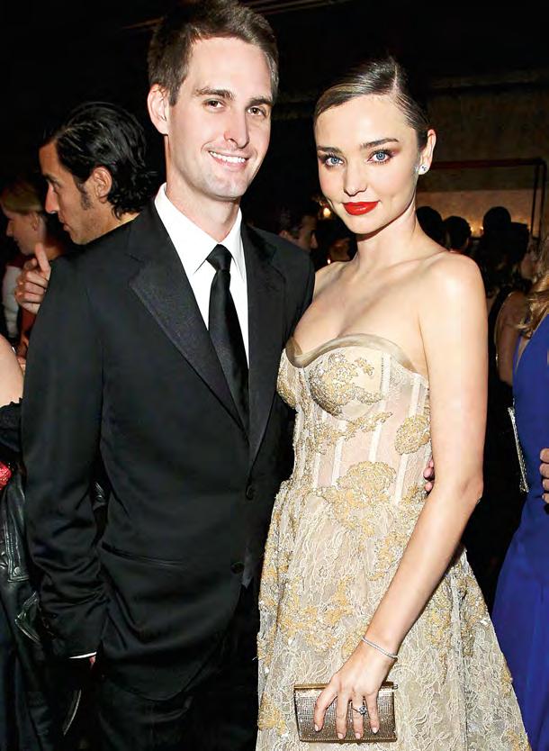 Spiegel, por su parte, es tan o más famoso que Orlando Bloom –el primer marido de Miranda y padre de su hijo Flynn (6)–, al menos en el mundo tech. En junio de 2014 tuvo una gran portada en Forbes tras rechazar la oferta de tres mil millones de dólares de Mark Zuckerberg por la adquisición de Snapchat. Frustrado por la negativa de su rival, Zuckerberg –propieta rio también de WhatsApp e Instagram–, lanzó al mercado Instagram Stories con increíble éxito, y desde entonces la pelea ha estado absolutamente a su favor. Snapchat no ha podido sobreponerse a ese golpe, pese a que en marzo de este año, con bombos y platillos, Spiegel cubriera de amarillo la bolsa de Nueva York –haciendo alusión a los colores de su App e inclu yendo el ya clásico “fantasma” de su logo– cuando Snapchat registró su mediática apertura en el mercado de acciones, con una capitalización bursátil de 33 mil 500 millones de dólares. La situación para Snapchat –que sacó unos anteojos, espera lanzar un dron y está con una polémica apuesta por la geolo calización, que revela dónde están sus usuarios–, no es de las mejores, sobre todo después de que muchos inversionistas se cuestionaran la espléndida luna de miel de Spiegel con Miranda
