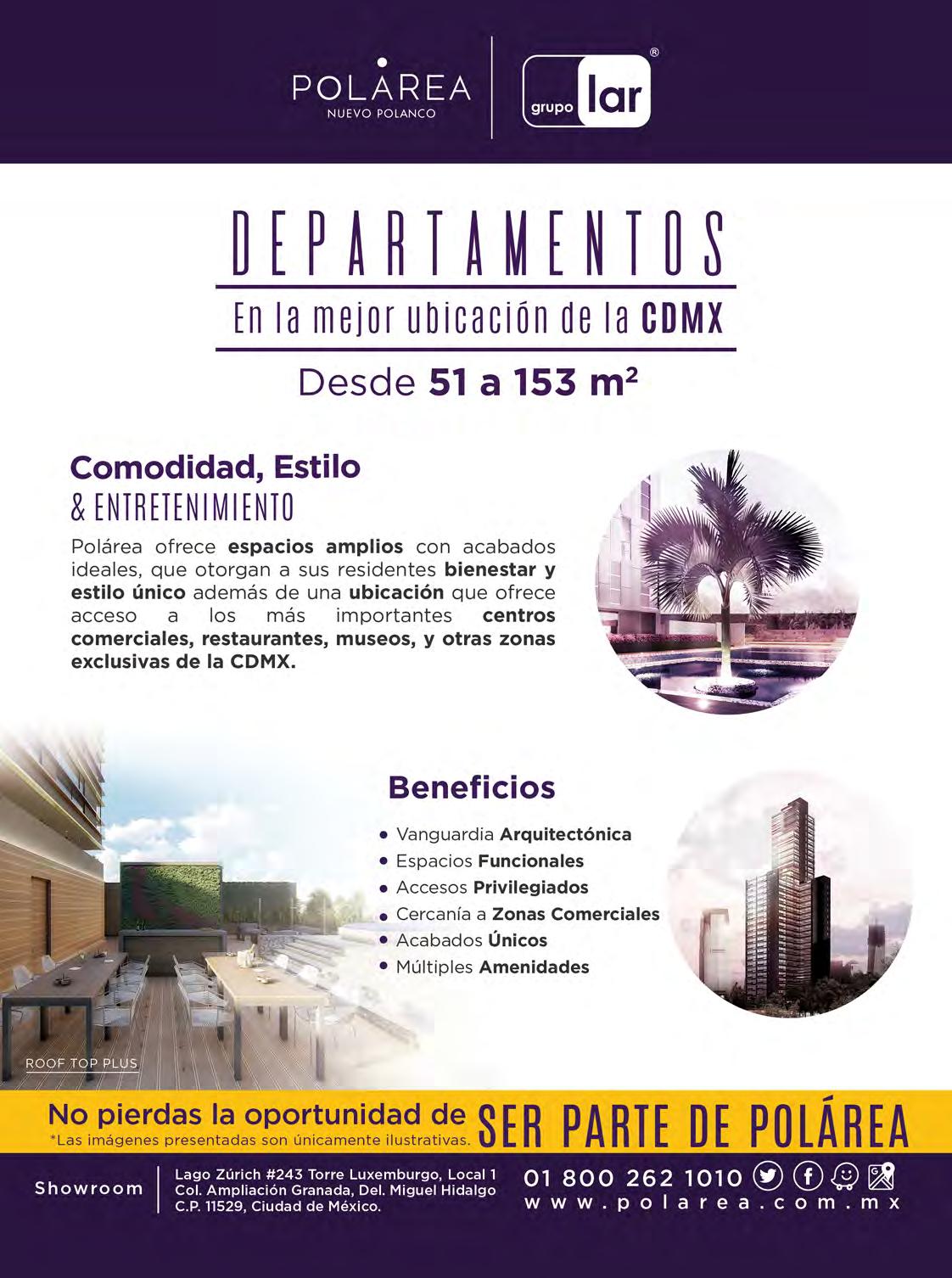 COLONOS POLANCO Año 3 • Número 37 • Junio de 2018. Es una publicación mensual de Grupo Mundo Ejecutivo®; Editada y publicada por: Comercializadora Mundo Rewards S.A. de C.V., Oficinas Generales: Río Nazas No. 34 Planta Baja, Col. Cuauhtémoc, C.P. 06500, Delegación Cuauhtémoc. México, CDMX. Teléfono: 5002-9500. www.mundoejecutivo.com.mx Editor Responsable: Rosa Arlenne Muñoz Vilchis. Certificado de Reserva de Derechos al Uso Exclusivo número 04-2010-041612575700101. Certificado de Licitud de Título y Contenido 14925. Se imprime en los talleres de Grupo Gráfico Romo S.A. De C.V. con dirección em San. José de Los Leones 9, Lazaro Cardenas, 53560 Naucalpan de Juárez, Méx. C.P. 53560, 21226050 ext: 3105. Los artículos firmados son responsabilidad de sus autores y no reflejan necesariamente el punto de vista del Editor de la publicación o de Grupo Mundo Ejecutivo®.Queda estrictamente prohibida la reproducción total o parcial de los contenidos e imágenes de la publicación sin previa autorización de Comercializadora Mundo Rewards S.A. de C.V. ©.Comercializadora Mundo Rewards S.A. de C.V. investiga sobre la seriedad de sus anunciantes, pero no se responsabiliza con las ofertas relacionadas por los mismos. 14 24