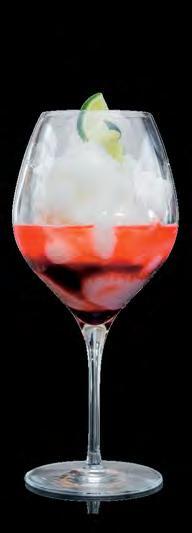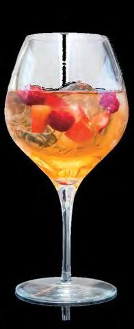 Servir en una copa de vino tinto con hielo el vino blanco y el refresco de manzana. Adornar con frutos rojos.