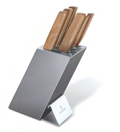 La colección de cuchillos serie Swiss Modern de Victorinox elaborados a mano en madera noble de nogal y acero inoxidable permite cortar sin esfuerzo, dejando una superficie de corte suave y limpia. El mango, está elaborado a mano en nogal europeo, una madera de color marrón oscuro y fuertemente veteada, que hace que cada pieza sea única. Ningún mango es igual al otro.