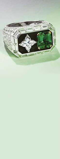 La colección Riders of the Knights High Jewellery trata sobre las heroínas medievales que cambiaron el curso de la historia a través de su fuerza y voluntad. Es la primera colección de alta joyería de la directora de diseño Francesca Amfitheatrof. El anillo con esmeraldas, ónix y diamantes. La forma de un anillo de sello.