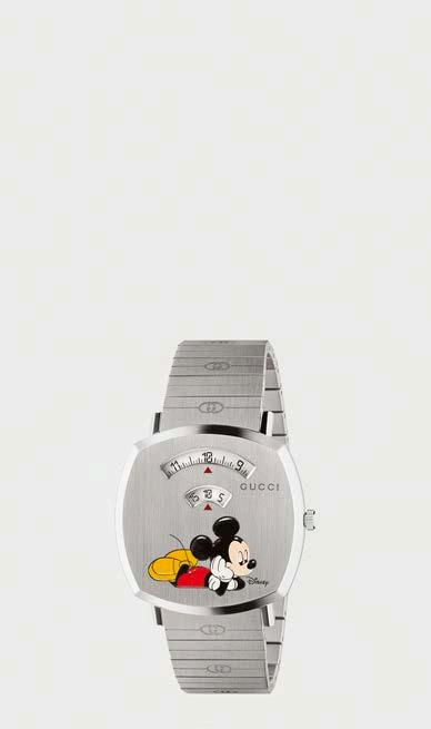 En honor al año de la rata del horóscopo chino, el legendario personaje de Disney aparece en toda la colección Gucci. Mickey Mouse adorna la caja de acero del reloj Grip. Tiene dos subesferas que muestran la hora y los minutos y correa de acero con el motivo GG. Resistencia al agua: 3 atm (30 metros/100 pies).