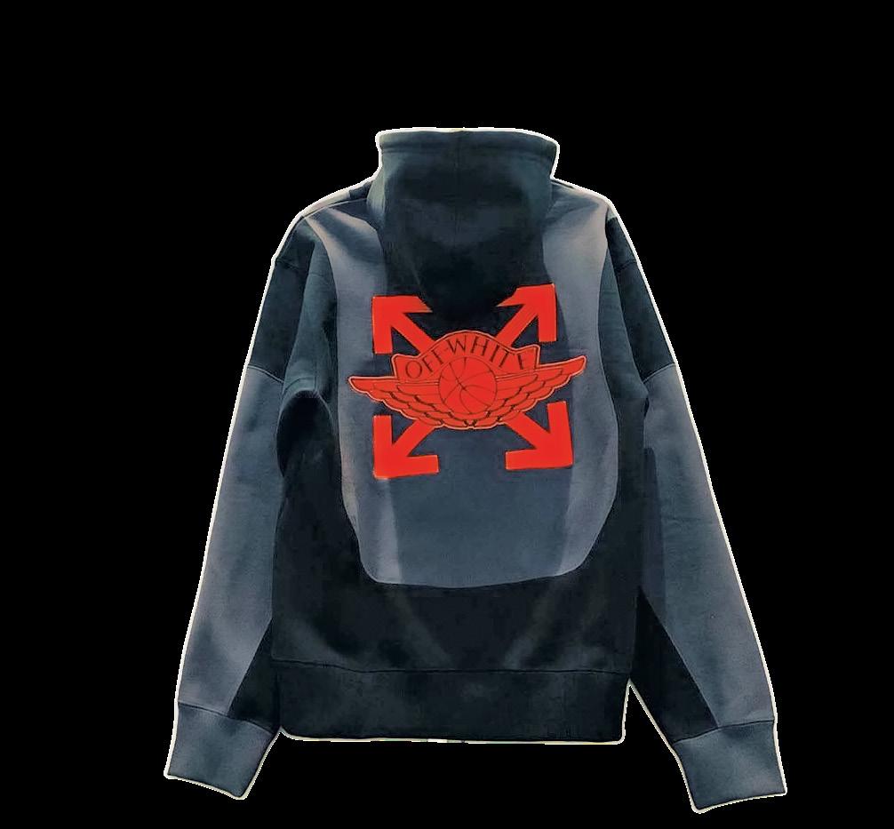 Off-White c / o Jordan ‘Flight School”, es la sudadera en colaboración. Viene con una capucha negra y una gran área gris en la parte posterior, sobre la cual se coloca la marca conjunta en rojo intenso: el motivo Air Jordan de Nike se incorpora al ícono de flechas cruzadas y agregando “Off-White” a la pancarta sobre el logotipo de Wings donde normalmente se estampa “Air Jordan”.