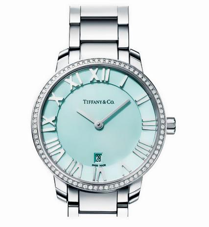 El reloj Atlas de acero inoxidable con esfera de azuré Tiffany Blue montada con diamantes de corte brillante redondo. Con un peso total en quilates de 0.14. Caja de 31 mm. Movimiento de cuarzo. Resistencia al agua de 50 metros/160 pies/5 ATM.