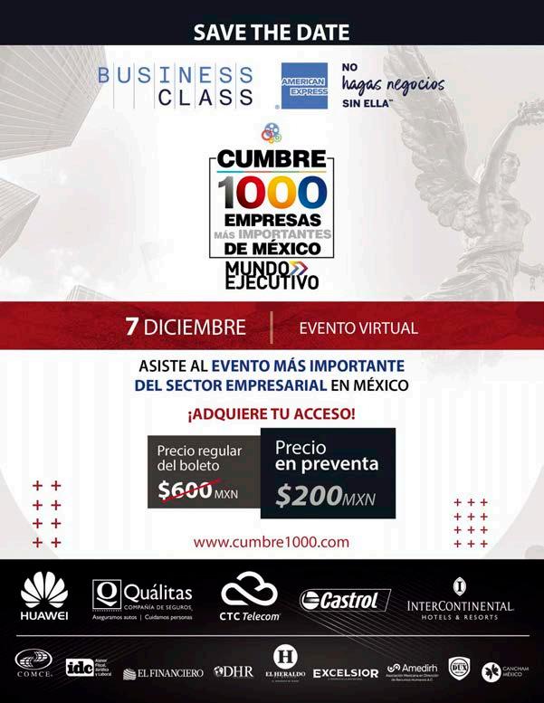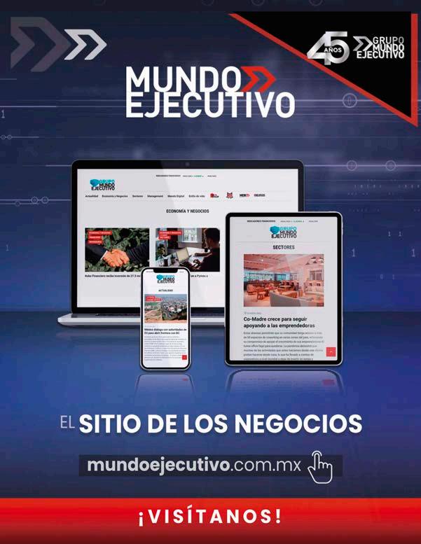 MUNDO EJECUTIVO ® Número 512 Septiembre 2021. Es una publicación mensual de Grupo Mundo Ejecutivo®; Editada y publicada por: Grupo Internacional Editorial, S.A. de C.V., Oficinas Generales: Río Nazas No. 34, Colonia. Cuauhtémoc, Alcaldía Cuauhtémoc, C.P. 06500, Ciudad de México, Teléfono: 55 5002-9500, www.mundoejecutivo.mx, Editor Responsable: Rosa Arlenne Muñoz Vilchis. Certificado de Reserva de Derechos al Uso Exclusivo número 04-2002-060617140200-102. Certificado de Licitud de Título número 6547, Certificado de Licitud de Contenido número 6938 ambos otorgados por la Comisión Calificadora de Publicaciones y Revistas Ilustradas de la Secretaría de Gobernación. Permiso SEPOMEX: PP09 – 0225. Se imprime en IMPREGRAFICA DIGITAL, S.A. DE C.V., Av, Coyoacan No. 100-D Col. Del Valle Norte., Del. Benito Juárez, Ciudad de México., C.P. 03103, Tel (55) 54260844. Tiraje impreso 51,000 ejemplares. Los artículos firmados son responsabilidad de sus autores y no reflejan necesariamente el punto de vista del editor de la publicación o de Grupo Mundo Ejecutivo®. Queda estrictamente prohibida la reproducción total o parcial de los contenidos e imágenes de la publicación sin previa autorización de Grupo Internacional Editorial, S.A. de C.V. © Grupo Internacional Editorial, S.A. de C.V. © investiga sobre la seriedad de sus anunciantes, pero no se responsabiliza con las ofertas relacionadas por los mismos. Esta es una publicación sólo para adultos.