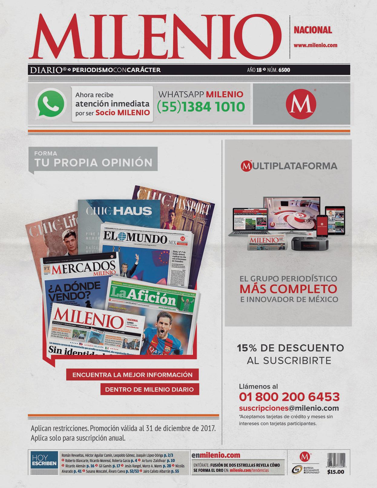 MUNDO EJECUTIVO ® Número 467 Diciembre 2017. Es una publicación mensual de Grupo Mundo Ejecutivo®; Editada y publicada por: Grupo Internacional Editorial, S.A. de C.V., Oficinas Generales: Río Nazas No. 34, Col. Cuauhtémoc, C.P. 06500 México, D.F. Teléfono: 5002-9500 www.mundoejecutivo.mx Editor Responsable: Arlenne Muñoz Vilchis. Certificado de Reserva de Derechos al Uso Exclusivo número 04-2002-060617140200-102. Certificado de Licitud de Título número 6547, Certificado de Licitud de Contenido número 6938 ambos otorgados por la Comisión Calificadora de Publicaciones y Revistas Ilustradas de la Secretaría de Gobernación. Permiso SEPOMEX: PP09 – 0225. Se imprime en Compañía Impresora El Universal, S.A. de C.V., Allende 174, Colonia Guerrero, Delegación Cuauhtémoc, C.P. 06300, Ciudad de México. Tiraje impreso 51,000 ejemplares. Los artículos firmados son responsabilidad de sus autores y no reflejan necesariamente el punto de vista del editor de la publicación o de Grupo Mundo Ejecutivo®. Queda estrictamente prohibida la reproducción total o parcial de los contenidos e imágenes de la publicación sin previa autorización de Grupo Internacional Editorial, S.A. de C.V. © Grupo Internacional Editorial, S.A. de C.V. © investiga sobre la seriedad de sus anunciantes, pero no se responsabiliza con las ofertas relacionadas por los mismos. Esta es una publicación sólo para adultos.