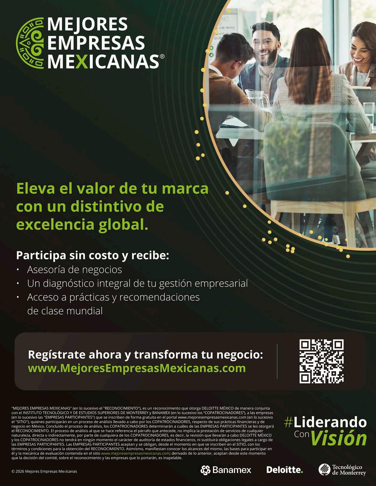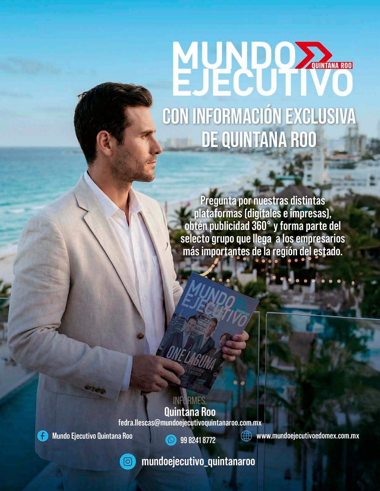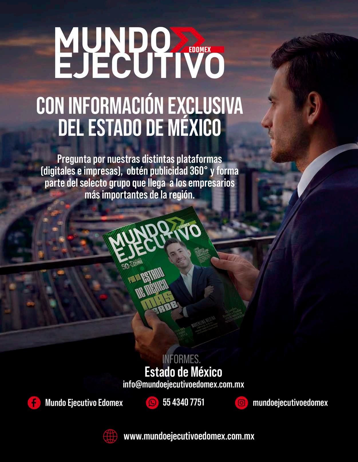 MUNDO EJECUTIVO ® Número 565 Febrero 2026. Es una publicación mensual de Grupo Mundo Ejecutivo®; Editada y publicada por: Grupo Internacional Editorial, S.A. de C.V., Oficinas Generales: Río Nazas No. 34, Colonia. Cuauhtémoc, Alcaldía Cuauhtémoc, C.P. 06500, Ciudad de México, Teléfono: 55 5002-9500, www.mundoejecutivo.mx, Editor Responsable: Rosa Arlenne Muñoz Vilchis. Certificado de Reserva de Derechos al Uso Exclusivo número 04-2002-060617140200-102. Certificado de Licitud de Título número 6547, Certificado de Licitud de Contenido número 6938 ambos otorgados por la Comisión Calificadora de Publicaciones y Revistas Ilustradas de la Secretaría de Gobernación. Permiso SEPOMEX: PP09 – 0225. Se imprime en Smartpress Vision, S.A. de C.V. Caravaggio 30, Col. Mixcoac, Benito Juárez, 03910, Ciudad de México. Tel.: 55-5611-7420 y 55-5611-7349. Tiraje impreso 51,000 ejemplares. Los artículos firmados son responsabilidad de sus autores y no reflejan necesariamente el punto de vista del editor de la publicación o de Grupo Mundo Ejecutivo®. Queda estrictamente