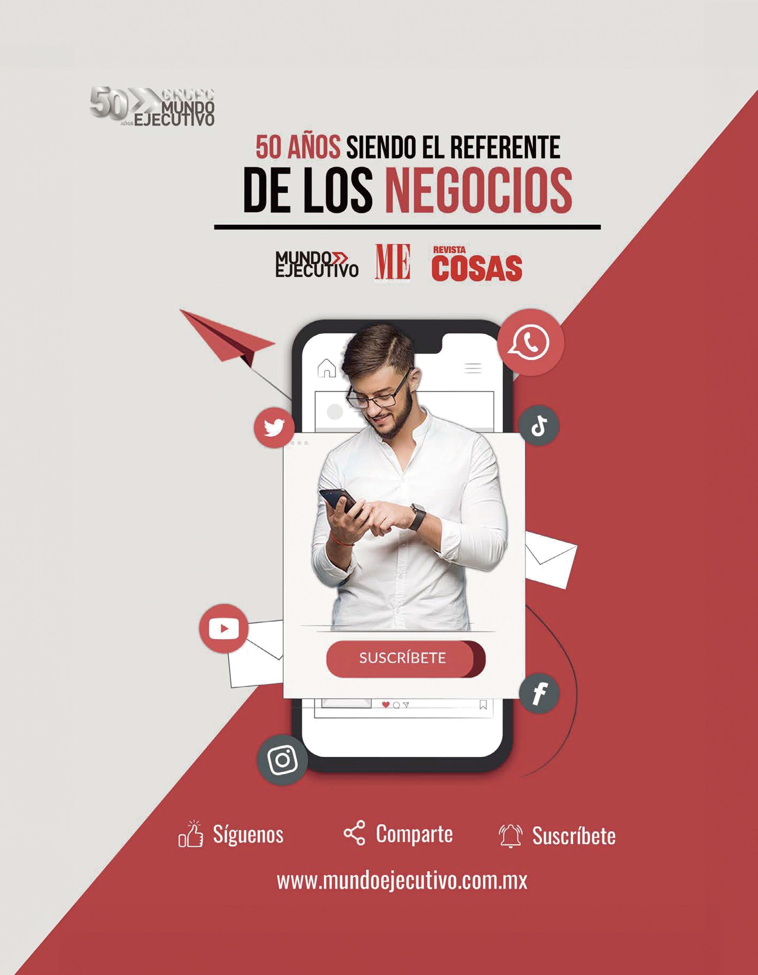 MUNDO EJECUTIVO ® Número 10 Octubre 2024. Es una publicación mensual de Grupo Mundo Ejecutivo®; Editada y publicada por: Grupo Internacional Editorial, S.A. de C.V., Oficinas Generales: Río Nazas No. 34, Colonia. Cuauhtémoc, Alcaldía Cuauhtémoc, C.P. 06500, Ciudad de México, Teléfono: 55 5002-9500, www.mundoejecutivo.mx, Editor Responsable: Rosa Arlenne Muñoz Vilchis. Certificado de Reserva de Derechos al Uso Exclusivo número 04-2002-060617140200-102. Certificado de Licitud de Título número 6547, Certificado de Licitud de Contenido número 6938 ambos otorgados por la Comisión Calificadora de Publicaciones y Revistas Ilustradas de la Secretaría de Gobernación. Permiso SEPOMEX: PP09 – 0225. Se imprime en SMARTPRESS VISION, S.A. DE C.V., Caravaggio 30, Col Mixcoac, CDMX C.P. 03910, TEL 55 5611 8060. Tiraje impreso 51,000 ejemplares. Los artículos firmados son responsabilidad de sus autores y no reflejan necesariamente el punto de vista del editor de la publicación o de Grupo Mundo Ejecutivo®. Queda estrictamente prohibida la reproducción total o parcial de los contenidos e imágenes de