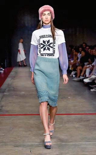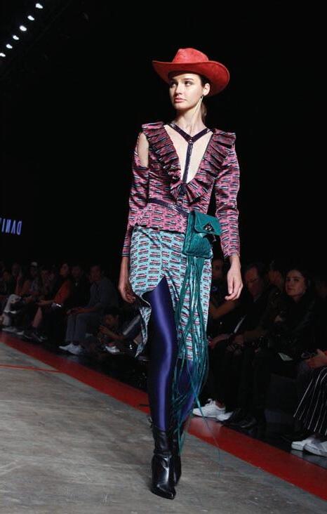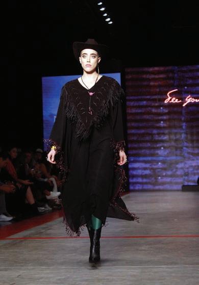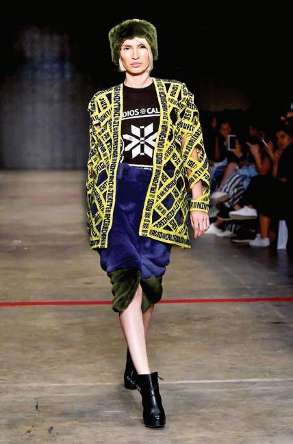 La narrativa tex-mex de Daniela Villa, con colores vibrantes, música del grupo Nortec Collective y el arte visual de Olivia Steele dejo una grata impresión en el Frontón de la Ciudad de México. Vestidos cortos, abrigos y faldas complementados con detalles de cristales, cinturones y tejanas con botas vaqueras de la marca regiomontana Ramiro Olivares cautivaran en el invierno este año.