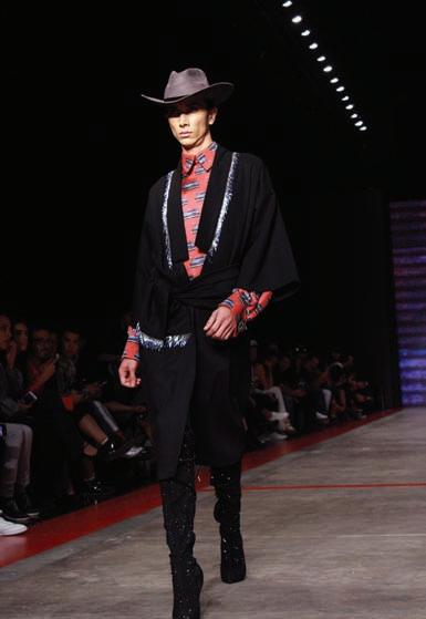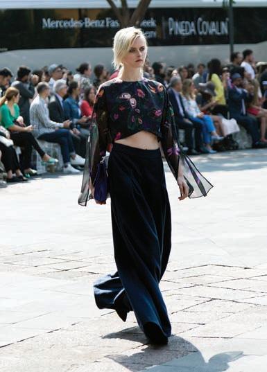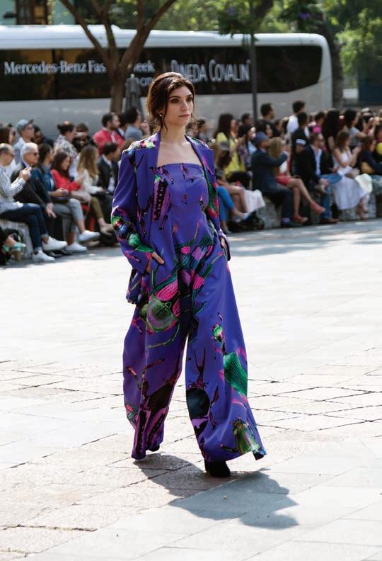 Convirtiendo el Ángel de la Independencia en pasarela, Alfredo Martínez nos propone prendas inspiradas en la ferocidad de los Cazcanes para defender sus ideales y tradiciones. Terciopelo, seda y lana, fusionan la historia con la modernidad en los tonos de temporada; negro y mostaza.