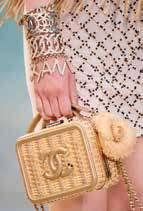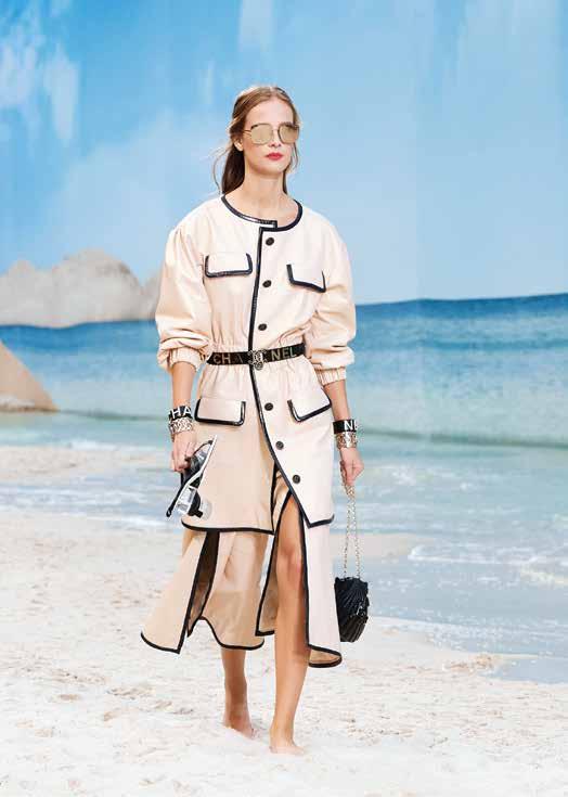 Se suma al look las gorras de doble visera y sombreros de ala ancha en paja con flecos, junto con capas, colgantes y collares de cuentas, mientras que las pulseras de brazalete XXL se multiplican. Se adicionan mules y bolsos de tweed y de playa.