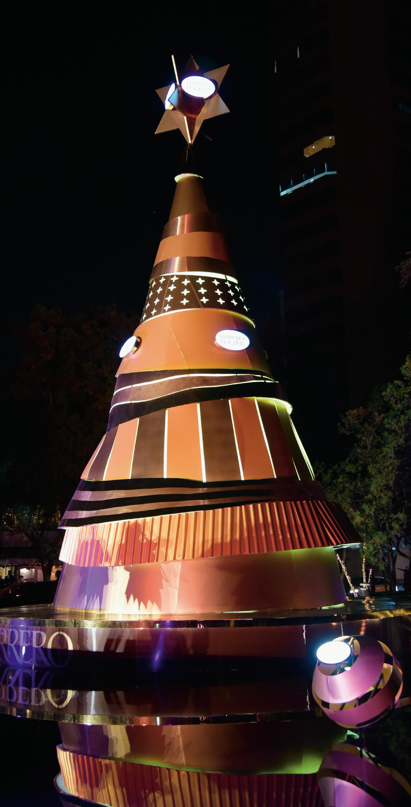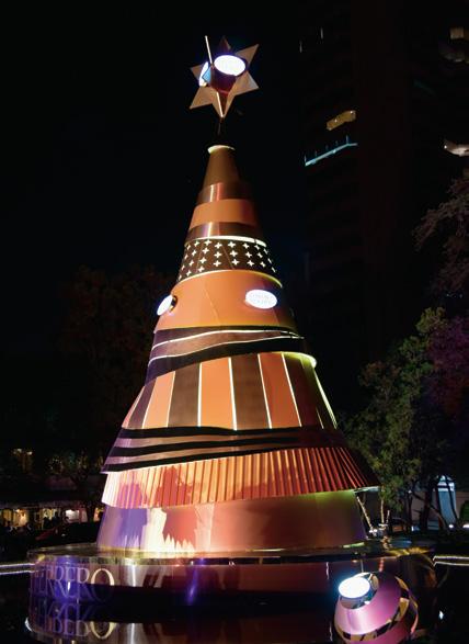 Por segundo año consecutivo, Ferrero Rocher iluminó el Parque Lincoln con un árbol de 14 metros de altura elaborado de circunferencias de diferentes tamaños y matices. Inspirado en elementos icónicos de la marca, las texturas y los tonos dorados se postran sobre los espejos de agua del emblemático jardín ubicado en el corazón de Polanco.