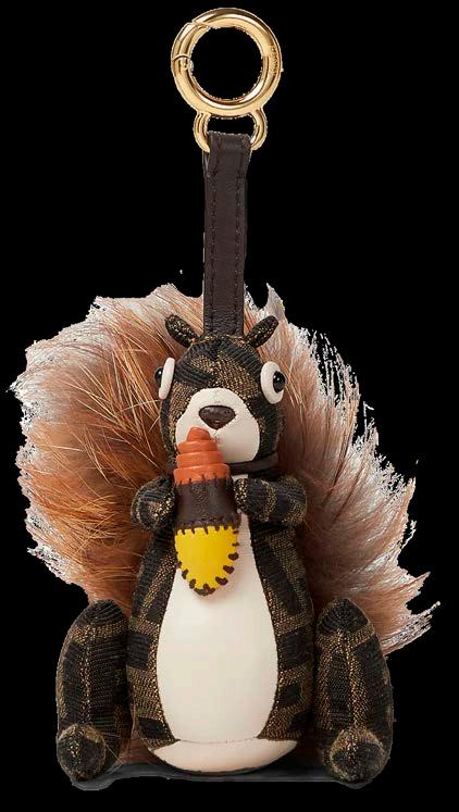 Fendi convierte un símbolo de fantasía en un emblema de sofisticación con su encantador charm en forma de ardilla. Elaborado en tejido jacquard con el icónico patrón FF, esta pieza capta la atención con su bellota multicolor en piel y una cola de zorro que añade un toque lúdico y exquisito