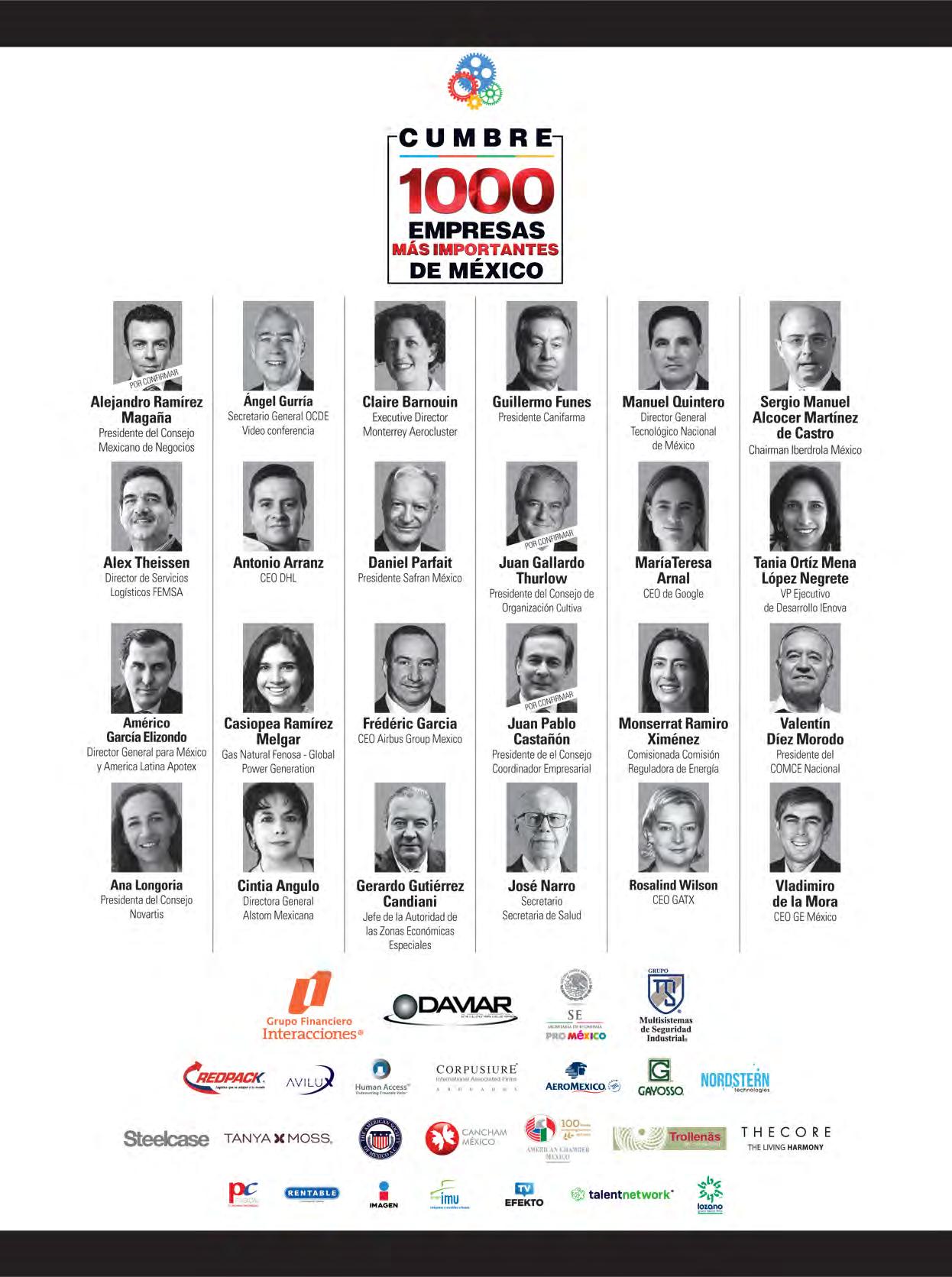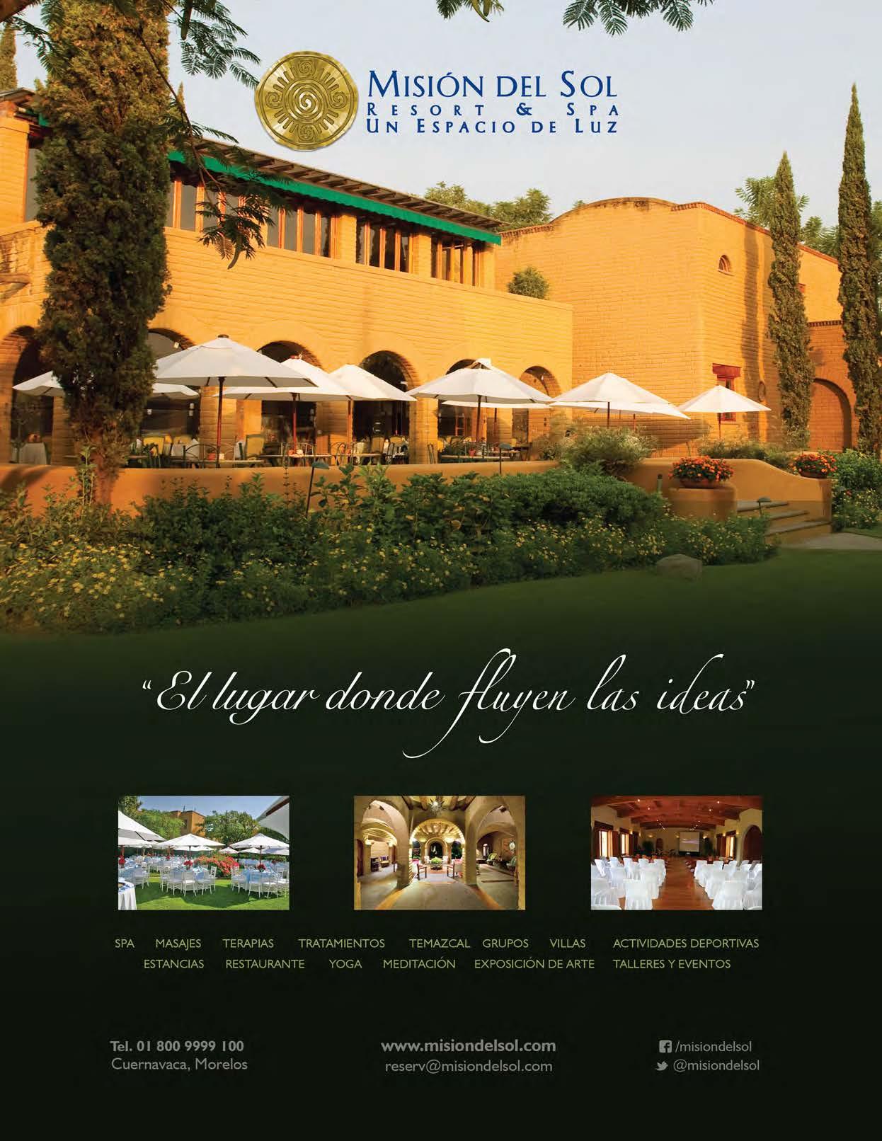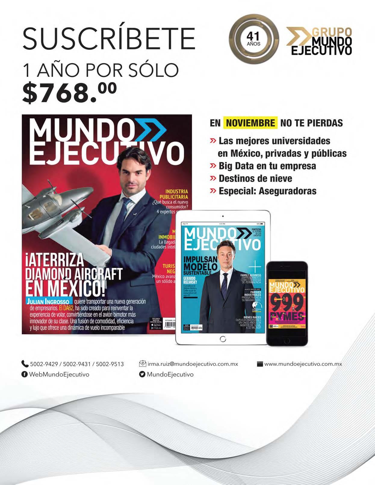 MUNDO EJECUTIVO ® Número 465 Octubre-Noviembre 2017. Es una publicación mensual de Grupo Mundo Ejecutivo®; Editada y publicada por: Grupo Internacional Editorial, S.A. de C.V., Oficinas Generales: Río Nazas No. 34, Col. Cuauhtémoc, C.P. 06500 México, D.F. Teléfono: 5002-9500 www.mundoejecutivo.mx Editor Responsable: Arlenne Muñoz Vilchis. Certificado de Reserva de Derechos al Uso Exclusivo número 04-2002-060617140200-102. Certificado de Licitud de Título número 6547, Certificado de Licitud de Contenido número 6938 ambos otorgados por la Comisión Calificadora de Publicaciones y Revistas Ilustradas de la Secretaría de Gobernación. Permiso SEPOMEX: PP09 – 0225. Se imprime en VIDA Y PLACER IMPRESIONES: Xochiquetzal No.17 esq. Arroyo Tlaloc Col. Estrella del Sur Iztapalapa, C.P. 09820 Tel. 76772121, Ciudad de México. Tiraje impreso 51,000 ejemplares. Los artículos firmados son responsabilidad de sus autores y no reflejan necesariamente el punto de vista del editor de la publicación o de Grupo Mundo Ejecutivo®. Queda estrictamente prohibida la reproducción total o parcial de los contenidos e imágenes de la publicación sin previa autorización de Grupo Internacional Editorial, S.A. de C.V. © Grupo Internacional Editorial, S.A. de C.V. © investiga sobre la seriedad de sus anunciantes, pero no se responsabiliza con las ofertas relacionadas por los mismos. Esta es una publicación sólo para adultos.