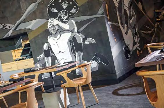 De piso a techo, Canalla Bistro está cubierto por láminas de madera que contrastan con muros de piedra, decorados por el artista urbano mexicano Seher One. La cocina, visible a los comensales, es una enorme barra que complementa el estilo del restaurante. //@revistacosas.mx