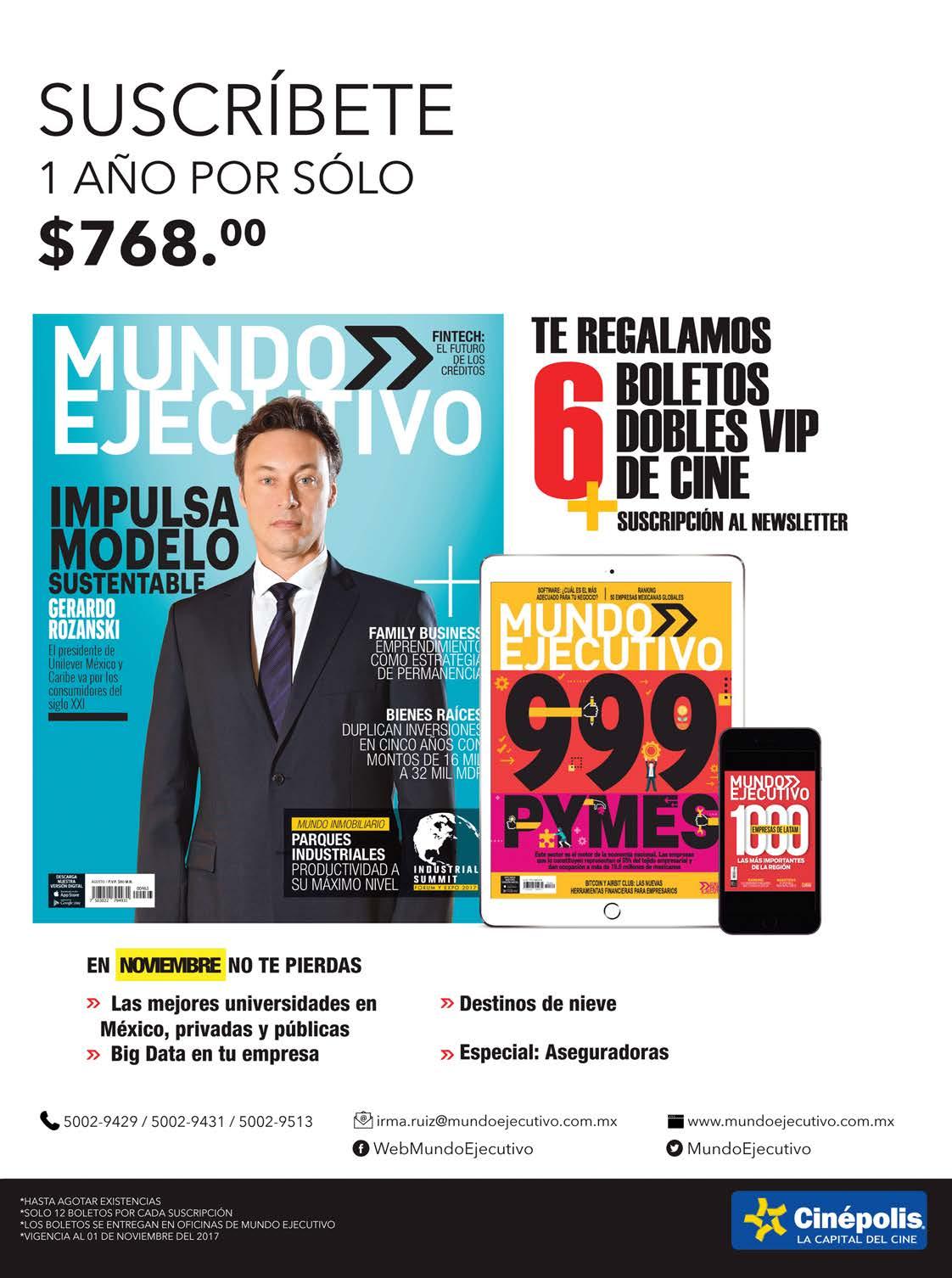 Directora de producto: Claudia Coratella Editor Adjunto: Luis Felipe Castañeda Editora: Bianca Pescador Reporteros: Alberto Vega y Regina Lázaro Editor de Fotografía: Antonio Soto Fotografía: Ricardo Trejo y Jesús Gutiérrez Directora de Arte: Nax Aguilar Diseño: Gustavo Gómez, Ma. Fernanda Osorio y Nayhely Hernández Arte Digital: Ericka Castillo y Miguel Fajardo Asistente Editorial: Ma. Eugenia Mata Gerente de Producción y Compras: Zitlaltzin Villagrán Asistente de Producción y Tráfico: Atahín Bautista Producción y Control de Calidad: Aarón Rangel Dirección Comercial: Benjamín Fontaine Director de Cuentas Estratégicas: José Antonio Kuri Publisher Mundo Inmobiliario: Carlota Montoya Mercadotecnia: Daniel Pérez Relaciones Públicas y Nuevos Negocios: Arlenne Muñoz Gerente Comercial: Alejandra Ramos alejandra. ramos@mundoejecutivo.com.mx Responsable de suscripciones: Irma Ruiz irma.ruiz@mundoejecutivo.com.mx Tels. 5002 9429, 5002 9513, 5002 9431 y 5002 9428